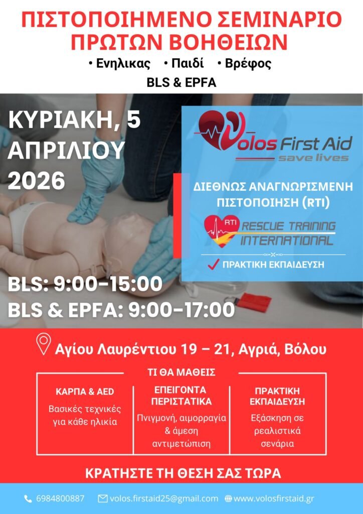 Ημερομηνία: Κυριακή 5 ΑπριλίουΤοποθεσία: Αγίου Λαυρεντίου 19–21, Αγριά Βόλου 373 00 Ώρες διεξαγωγής:• BLS: 09:00…