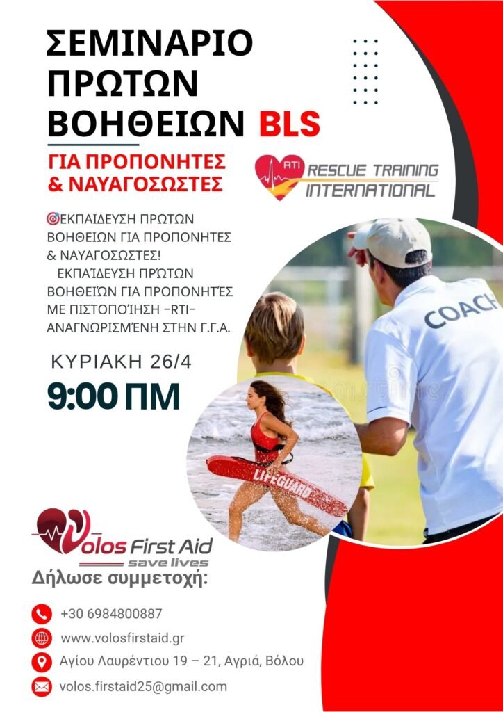 Την Κυριακή 26 Απριλίου 2026, η Volos First Aid διοργανώνει εξειδικευμένο σεμινάριο Πρώτων Βοηθειών με πιστοποίηση BLS (Basic Life Support), ειδικά σχεδιασμένο για προπονητές και ναυαγοσώστες. Η έναρξη του σεμιναρίου θα πραγματοποιηθεί στις 09:00 π.μ.